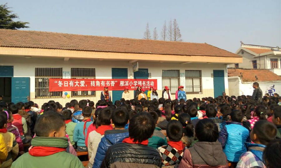 2014年12月24日英国365上市公司情系村小社团的志愿者们来到雁滨小学,开展了“冬日存大爱·转角有书香”的志愿活动,为孩子们送去了祝福和温暖。全校学生积极参与了活动,使此次的温暖之行画上了圆满的句号。