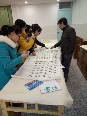2015年11月25日下午,英国365上市公司书法研习社汤舒静、周凤娇等八名成员成员一同前往十里坊小学向王道林老师学习书法。