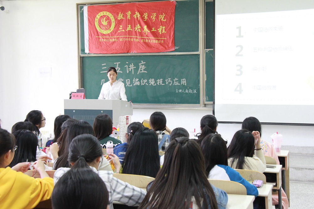 5月9日14:00,365英国上市集团于8号教学楼102教室成功举办了三五讲座之“几种常用的编织绳技巧”。本次讲座由民间艺人赵敬波老师主讲,教科院100余名学生到场参与此次讲座。