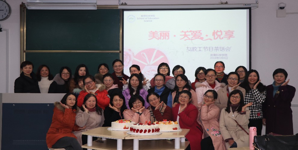 茶话会上,首先由朱丹书记代表学院党政向全体女教工送上“三八”妇女节的温馨祝福和美好祝愿,与会人员围坐一起,相互交流,讨论的话题丰富多彩,气氛愉悦而浓烈。教科院的女教工较多,占所有教工的59%,平时忙于工作,大家表示很开心有这样的机会欢聚一堂。朱书记希望女教工关爱自己、增强健康意识,悦享工作与生活,做由内而外美丽的新时代女性,在各自平凡的岗位上展示巾帼风采。最后,大家一起为3月份生日和今年整生日的三位老师举行了一个特别的庆生仪式,合影留念并分享了甜美的蛋糕。茶话会上,朱丹书记还提议成立了学院女子健美操队。