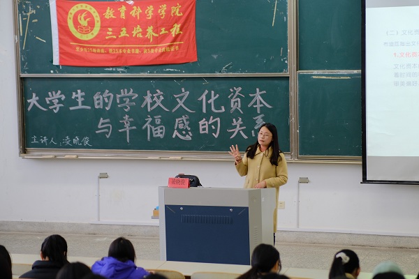 此次讲座中,凌晓俊老师由“看到‘资本’你会想到什么?”这个问题引入,为大家介绍了什么是文化资本。学校文化资本是一个新概念,指的是一所学校所拥有的各种有形的和无形的文化资源总和。凌老师认为大学生文化资本的积累受到其所在学校文化资本的影响,一个学校拥有怎样的资源,以怎样的途径提供给学生,都对学生的发展产生影响。凌晓俊老师就幸福感的产生与形成,向大家分析了大学生的幸福感来源,其中学业的评估占比最高,因此不难得出结论:大学生拥有的文化资本与他们的幸福感息息相关。学校提供了文化资本,但是如果学生不加以利用,则一切都是空谈,为此凌老师建议大学生应以学业为重,充分利用学校提供的文化资源,积极参与社交与活动,发展自己,让自己在拥有一定文化资本的基础上去拥抱幸福。