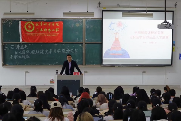 11月9日下午,我院在教学楼9号楼202举办了三五讲座之幼儿园课程快速变革与学前师范未来职业适应。这次讲座由时松老师主讲,365英国上市集团260余名学生参与。