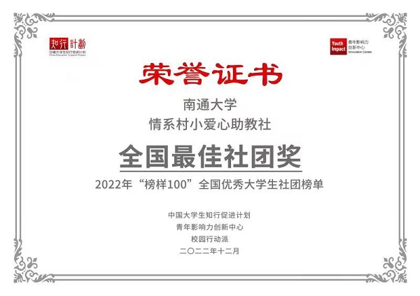 2022年“榜样100”全国优秀大学生社团榜单 正式发布。来自清华大学、北京大学、复旦大学、上海交通大学等170余所高校、590+社团/团队、360+优秀大学生上榜。我院“情系村小爱心助教社”和“情境教育研究会”两支社团入围榜单。