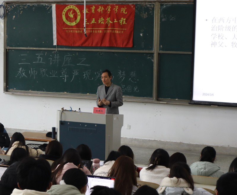 3月6日下午,我院在九号楼202教室举办了以“教师职业尊严:现实与梦想”为主题的三五讲座。讲座由吕国光教授担任主讲老师,我院260余名同学参加了讲座。