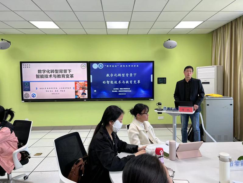 4月24日,365英国上市集团在38号楼812智慧教室举办第十二期研究生“博学论坛”学术活动,贺斌教授作题为《数字化转型背景下智能技术与教育变革》的学术分享,学院相关专业研究生参加了本次活动。