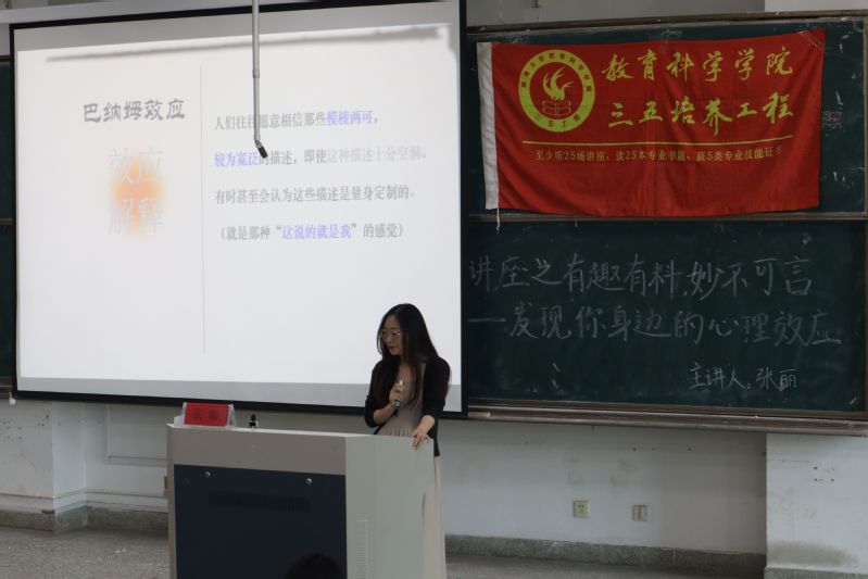 5月8日下午,我院在1号楼203教室举办以“有趣有料,妙不可言——发现你身边的心理效应”为主题的三五讲座,讲座由张丽老师主讲,我院260余名同学参加了讲座。