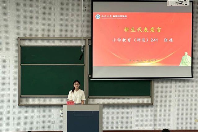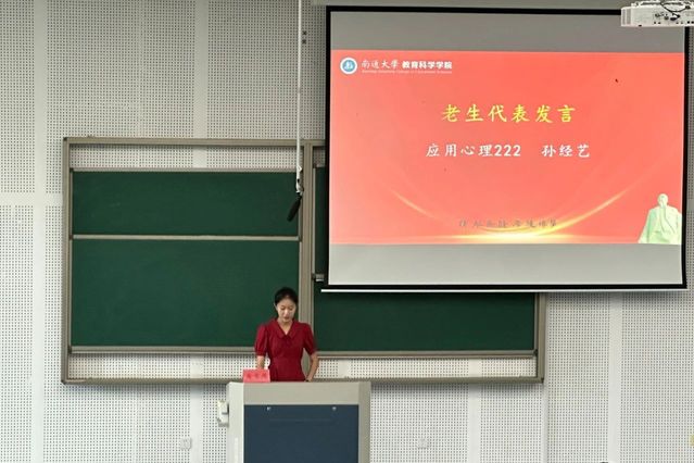 应心222班班长孙经艺同学作为老生代表,鼓励新生向上向善,勇于实践,勇于尝试。小教242班张越代表新生发言,她表示将会以一往无前的勇气和坚持不懈的精神,在困难中突破,在逆境中坚持。