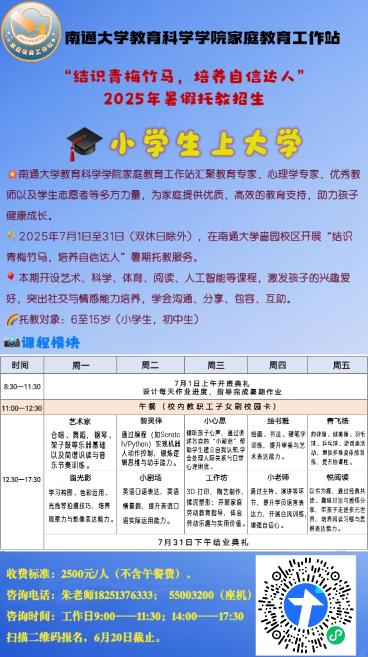 时间地点:2025年7月1日至31日(双休日除外),在英国365上市公司啬园校区(啬园路9号)开展“结识青梅竹马,培养自信达人”暑期托教服务。
