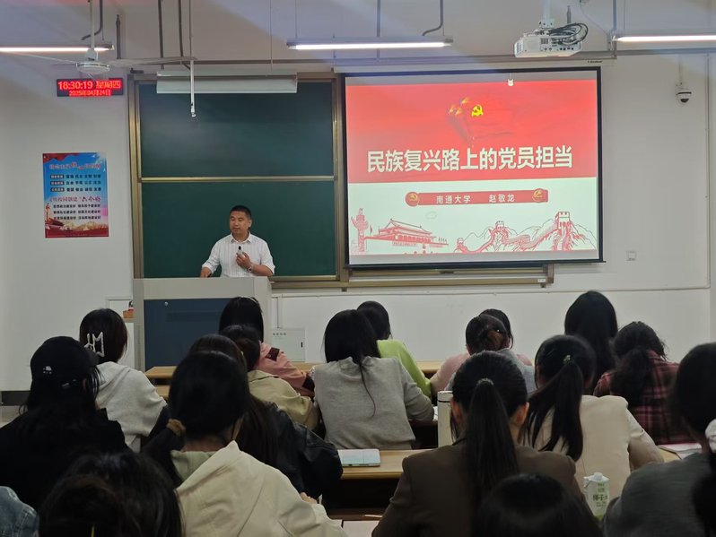 团委书记、本科生第二党支部书记赵敬龙老师作题为《民族复兴路上的党员担当》专题报告。他从百年来的伟大精神、党取得的四个伟大成就、新时代党员的伟大担当这三个层面,介绍了中国共产党在领导国家实现民族复兴的实践中付出的巨大努力和牺牲,展现了共产党人不忘初心、牢记使命的担当精神。